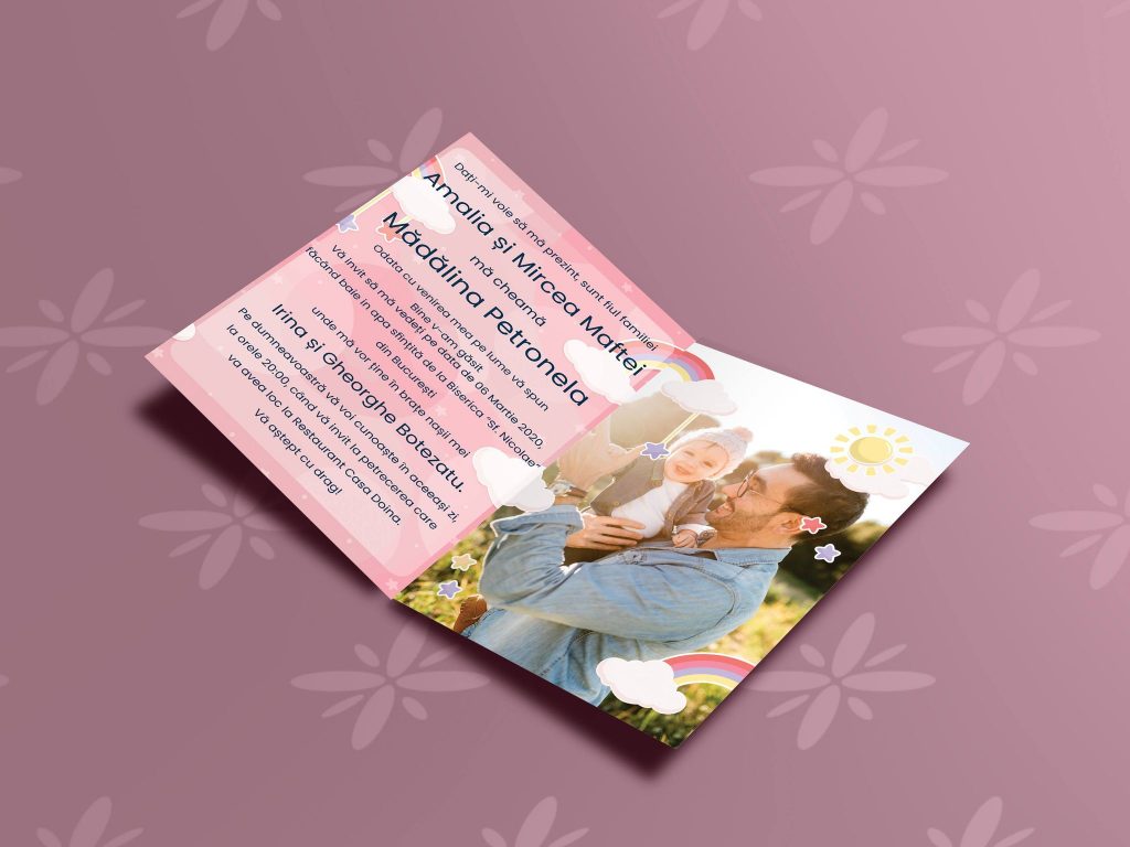 Aceasta, fotografia bebelusului vostru, reprezinta un element deosebit, cu care poti sa iti surprinzi persoanele dragi. Noi va personalizam invitatiile cu poza bebelusului, astfel fiecare invitat va avea o prima poza cu cel mic și isi va aduce cu drag aminte de el.